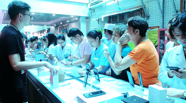活动当天虽然天气炎热,但也挡不住大家的热情,活动尚未开始,大家已经在服务现场等候。活动现场大家享受众多的优惠服务:全产品新机品鉴、福利优惠购、以旧换新、免费贴膜和手机清洗......本次活动不仅优惠力度大,而且受惠人群广,不仅我院工会会员享受到福利,还惠及到后勤服务中心和医疗服务中心的职工、规培生、实习生。活动得到大家热烈反响,在短短的2天共服务职工达500人次,300多位职工享受贴膜和手机清洗服务,100多位职工享受优惠购机服务,20位职工享受以旧换新服务。