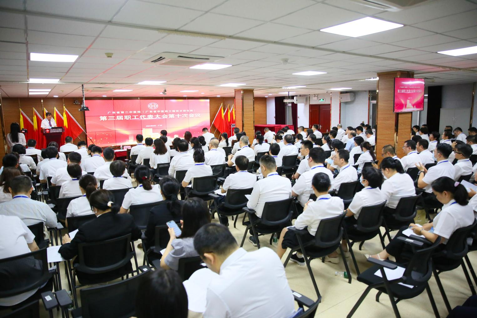 为深入学习贯彻党的二十大和二十届二中全会精神,认真落实省委“1310”具体部署和全省卫生健康和中医药工作会议精神,近日,广东省第二中医院在恒福路总院8楼会议室召开第三届第十次职工代表大会,全面总结2024年上半年医院工作,分析研判发展形势,部署2024年下半年重点工作。医院领导班子成员、职工代表、列席代表等共150人现场参加会议,白云院区、黄埔医院同步视频直播。医院党委副书记张立峰主持会议。