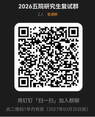 进入复试名单的考生(见附件3)扫码加入钉钉群:《2026五院研究生复试群》(入群二维码如下,添加时备注考生编号-姓名),发送实名认证截图到工作邮箱:sezyykjk@vip.163.com,无实名认证截图不予入群。