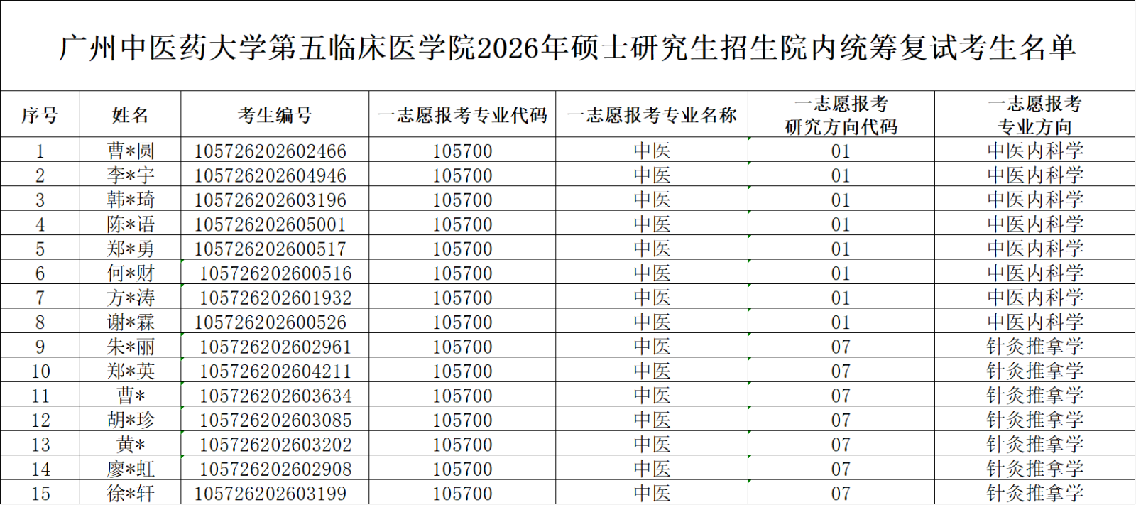 我院在一志愿复试结束后,对导师未完成招生计划的专业开展院内统筹复试工作。院内统筹复试比例为各专业余额招生计划的150%,按不同专业填报志愿的考生初试成绩从高到低排序确定院内统筹复试名单,对合格生源不足的专业按实际合格考生名单确定复试名单。现将我院2026年硕士研究生招生院内统筹复试考生名单予以公布,请各位考生下载钉钉APP,于3月28日上午10:00前加入“2026年五院研究生院内统筹复试”群(钉钉群号:163530016502),添加时备注考生编号-姓名。并在3月28日上午10:00前扫描下方二维码填写《广州中医药大学第五临床医学院2026年硕士研究生招生院内统筹复试考生意向报考专业及导师》。每位考生只认定一次有效填报信息,如多次报送,按截止时间最后一次报送的信息为准。
