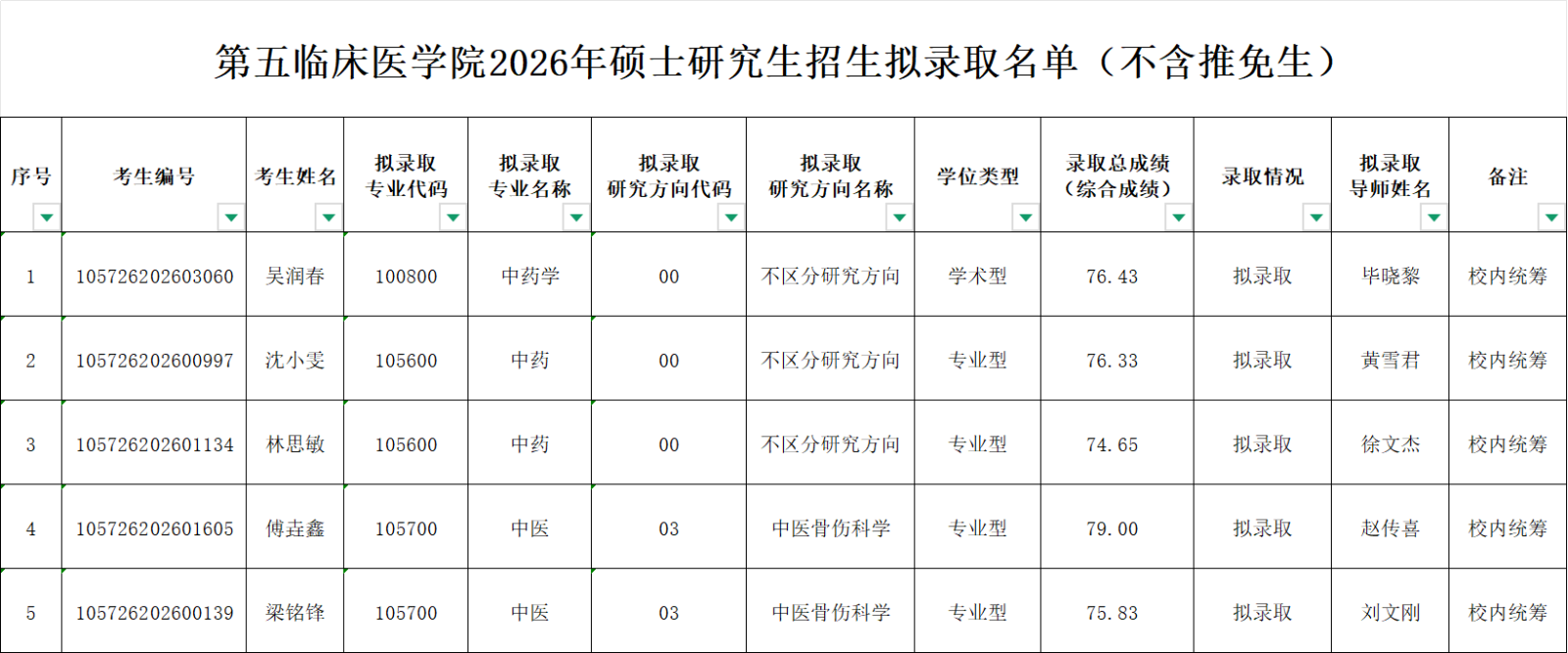 按照我院2026年硕士研究生招生复试录取工作细则,已完成校内统筹复试工作,现将拟录取名单进行公示,最终录取名单以广州中医药大学研究生院官网公布为准。