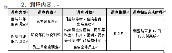 (2)医院内部服务调查:职能部门效能测评:样本量>800个,并根据医院调查科室数量和科室情况进行样本量分配;员工满意度调查:全院职工(有效样本量>800个,要求覆盖全部科室)。