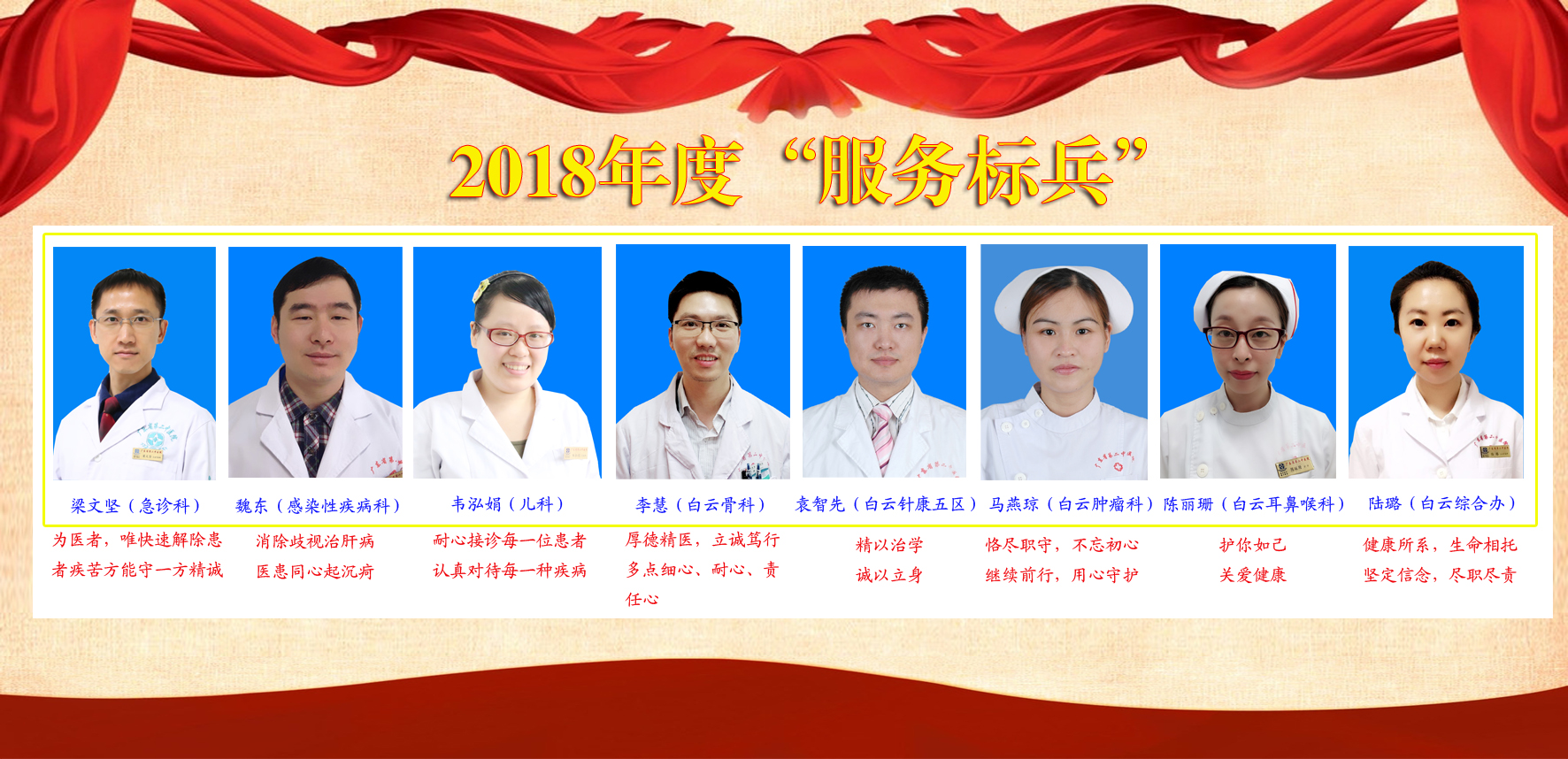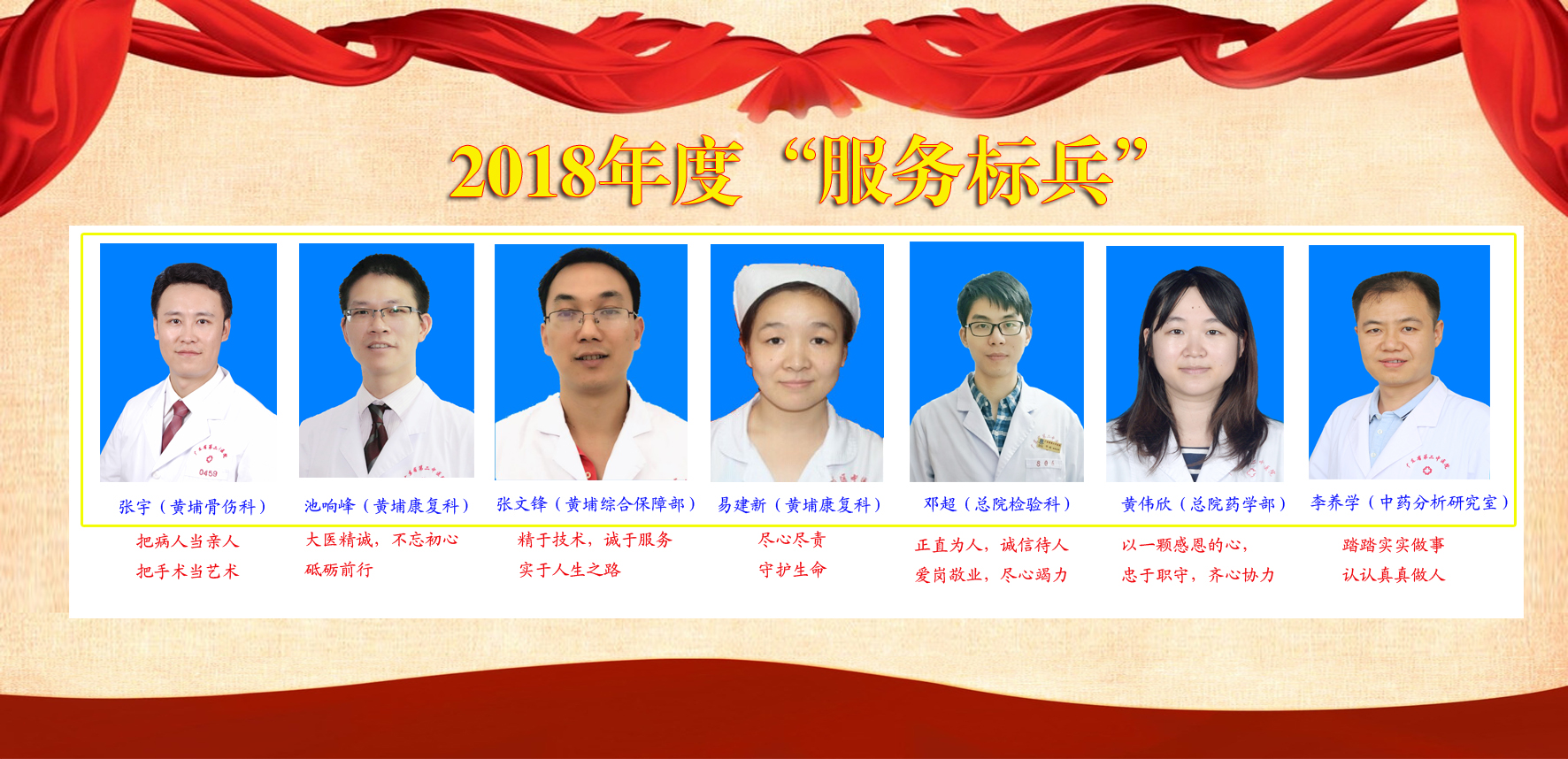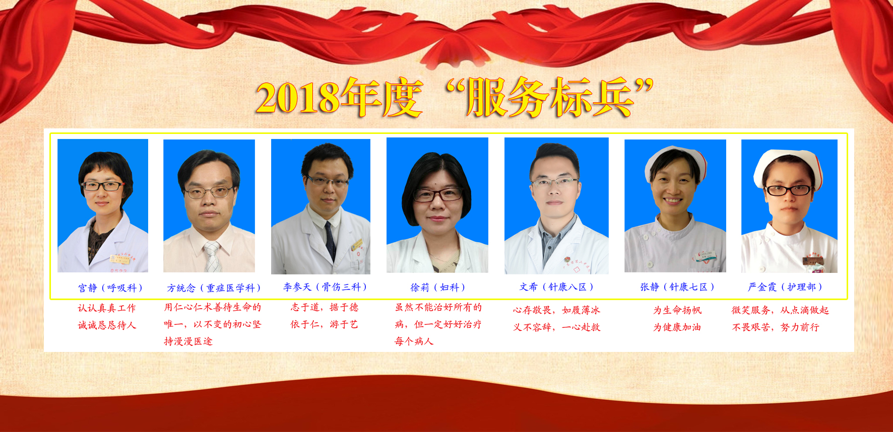 他们是2018年度“服务标兵”,他们发扬着爱岗敬业、乐于奉献的精神,他们在工作岗位上发挥着先进示范引领作用,让服务对象在细节中感受到医院的温暖。