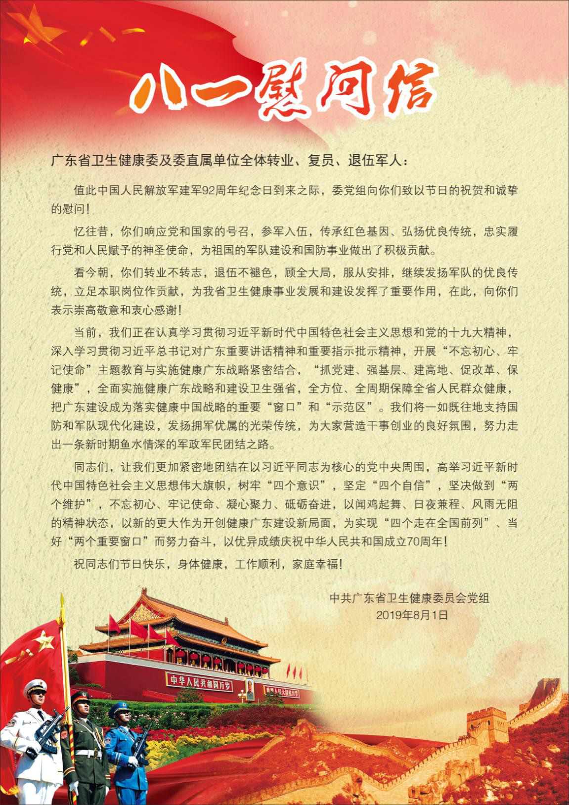 值此中国人民解放军建军92周年纪念日到来之际,广东省卫生健康委党组和医院党委向你们致以节日的祝贺和诚挚的慰问!祝大家节日快乐,身体健康,工作顺利,家庭幸福!
