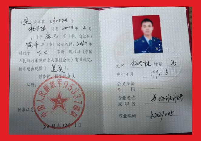 保安队队员杨冬佳同志:2008年12月至2013年12月服役。