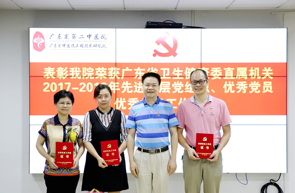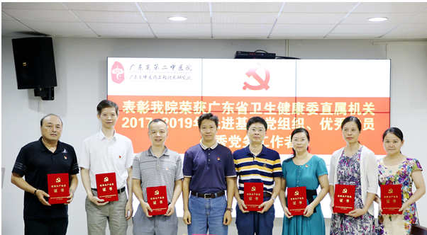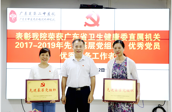 庆祝中国共产党成立98周年、新中国成立70周年,今年“七一”期间,省卫生健康委直属机关党委表彰了一批先进基层党组织、优秀共产党员和优秀党务工作者。其中,我院行政第三党支部、临床第四党支部获得广东省卫生健康委直属机关2017-2019年先进基层党组织;范烁楠、聂斌、叶远芳、詹文英、周敏、余德钊、秦敏、黄小丽、吴玉玲、李桂明、董玉娟、黄雪君等12名同志获得“优秀共产党员”称号;林晓洁、罗霄山、钟力3名同志获得“优秀党务工作者“称号。