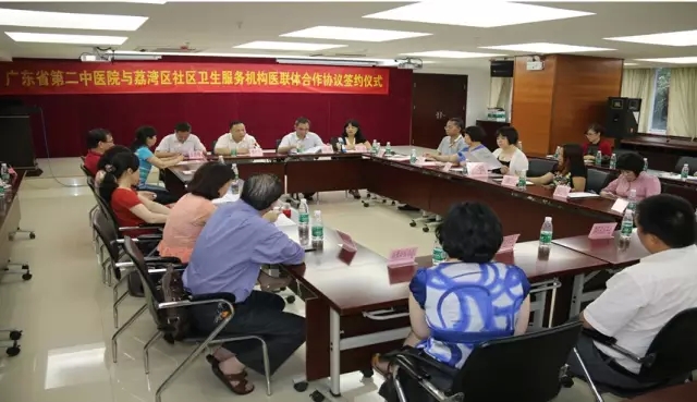 继与广州市越秀区17个基层医疗机构签约构建“医联体”后,2015年5月20日下午,在荔湾区卫生和计划生育局,我院与荔湾区20家社区卫生服务中心签订了医疗合作协议。荔湾区卫生和计划生育局顾湘局长、毕清副局长、杨国球副局长,以及我院曹礼忠院长、王清海副院长等人参加了签约仪式。根据协议,我院与荔湾区基层医疗卫生机构将开展以下几个方面的医疗联动。