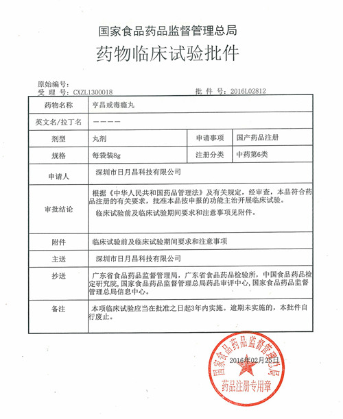 “亨昌戒毒瘾胶囊”为深圳市日月昌科技有限公司委托我院研发的中药六类新药,主要适用于阿片类成瘾戒断症状的治疗。药物临床试验批件号:2016L02812。
