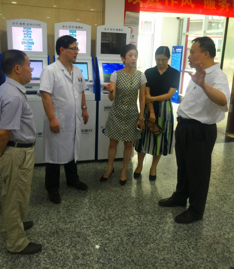 根据我院建设智慧型医院目标要求,经过前期论证、设计等筹备工作,2016年6月2日,我院“银医自助服务系统”测试成功,进入试运行阶段。6月7日,曹礼忠院长亲临现场了解系统运行情况,并对进一步完善系统功能提出了具体要求。孙冬梅副院长及财务科、信息科、门诊办等相关工作人员,现场讲解并指导患者使用新系统,进行自助挂号、自助预约挂号等操作。