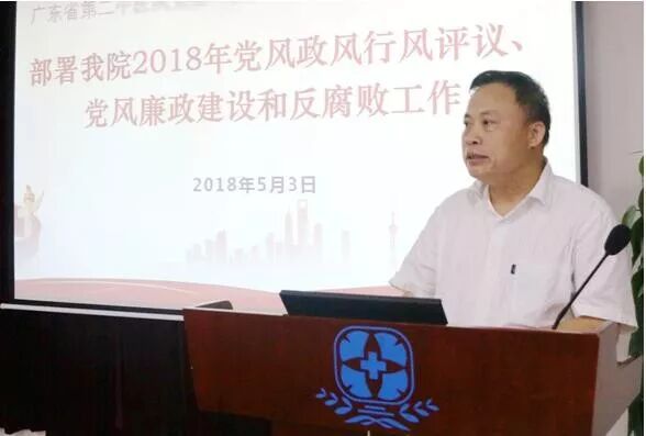会议的另一项重要内容,由医院纪检监察室副主任朱镇同志向大家传达了2018年全省卫生计生系统党风廉政建设和反腐败工作会议精神,结合医疗反腐倡廉工作要求,提醒大家要知敬畏、存戒惧、守底线。随后,曹书记强调要准确把握2018年省卫生计生委党风廉政建设和反腐败工作部署要求,深刻领会委党组书记、主任段宇飞同志的讲话精神,扎实推动全面从严治党向纵深发展。并结合医院实际,对2018年我院党风廉政建设和反腐败工作进行部署,重点抓好以下4方面工作:一是严明党的纪律,坚持依法依规从严治党;二是加强廉政教育,传递党风廉政建设正能量;三是抓党风,树新风,深入落实中央八项规定精神和“九不准”;四是切实履行党委主体责任和纪委监督责任,保持反腐高压态势。