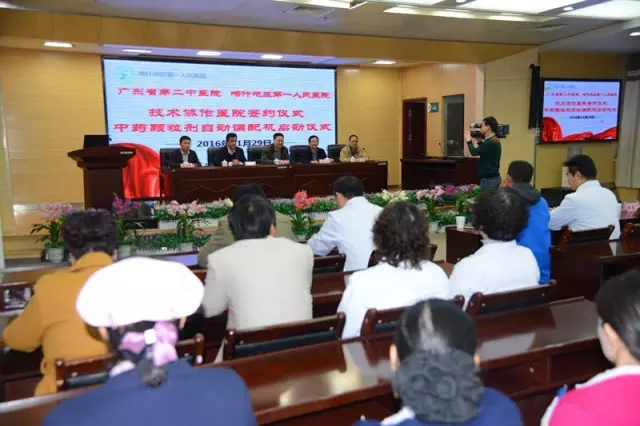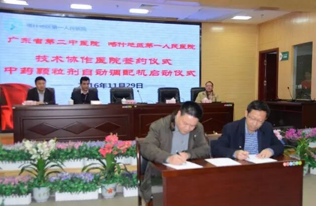 11月29日,我院与新疆喀什地区第一人民医院医院签定“正式建立技术协作关系”仪式在喀什第一人民医院隆重举行。喀地一院凯塞尔·阿不都吾甫尔书记主持会议,喀地一院邹小广院长,广东省第二中医院许学猛副院长,广东前指人教处副处长、喀什地区卫生计生委孙宝山副主任,广东一方制药有限公司吴文书记,喀地一院王怀振副院长出席签约仪式。